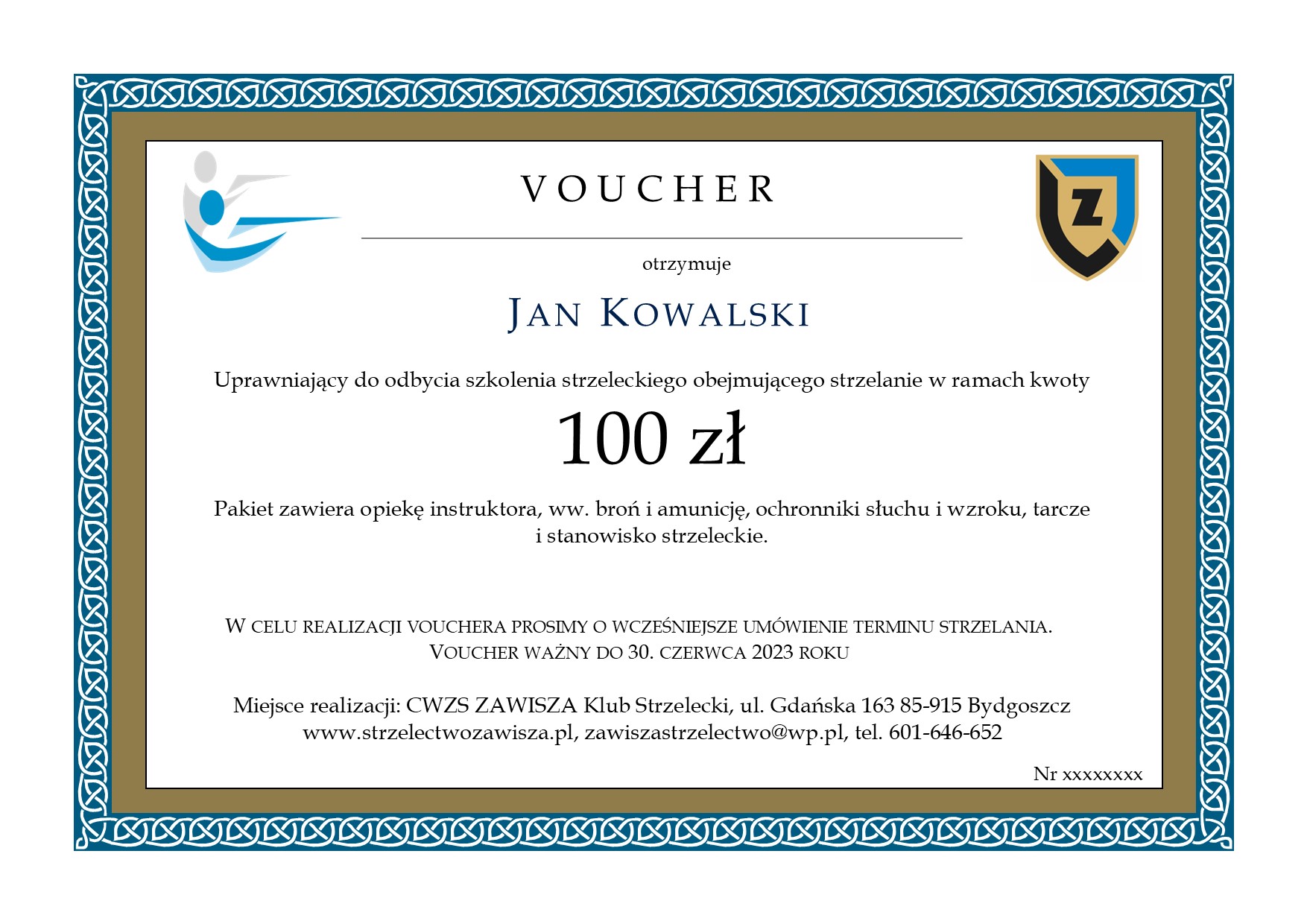 • Na kwotę- dzięki tej możliwości obdarowany sam lub z pomocą naszych instruktorów może wybrać z jakiego rodzaju broni będzie strzelał. Na voucherze wpisana jest kwota (100 zł lub wielokrotność tej kwoty).